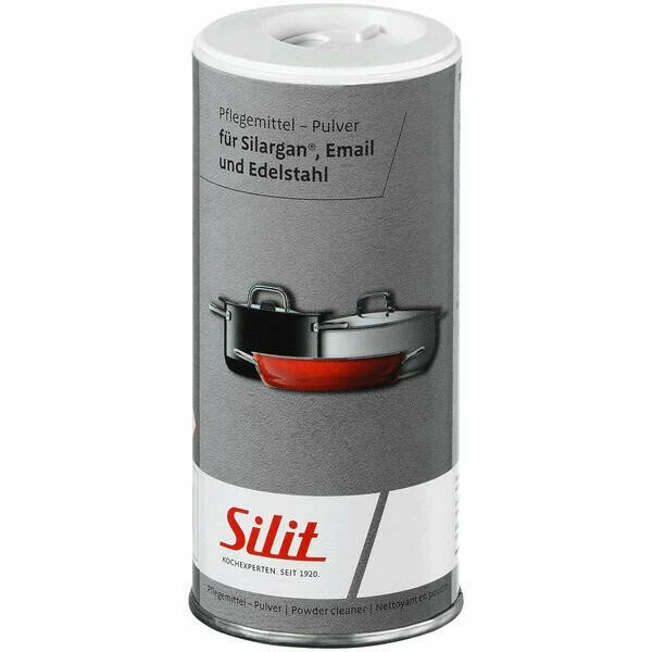 Strahlende, glänzende Töpfe für die Ewigkeit? Kein Problem mit der Pflegemittel-Pulver Dose von Silit – aufstreuen, mit einem Reinigungsschwamm einreiben, abspülen und fertig! Die Kochexperten von Silit versprechen einen Spezialreiniger für Silargan, Emaille und Edelstahl, mit dem Fett und Eingebranntes im Handumdrehen verschwinden. Kraftvoll und schonend verrichtet der Spezialreiniger dabei sein Werk. Zurück bleibt ein strahlender Glanz auf Töpfen und Pfannen. Zusätzlich pflegt das Pulver die Kochutensilien. Dank der Pflegemittel-Pulver Dose mit 200 g Inhalt ist ein langanhaltender Kochspaß somit gesichert.